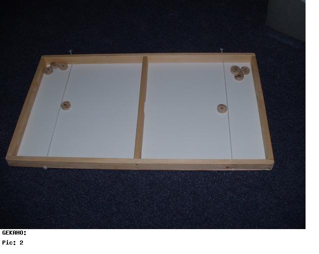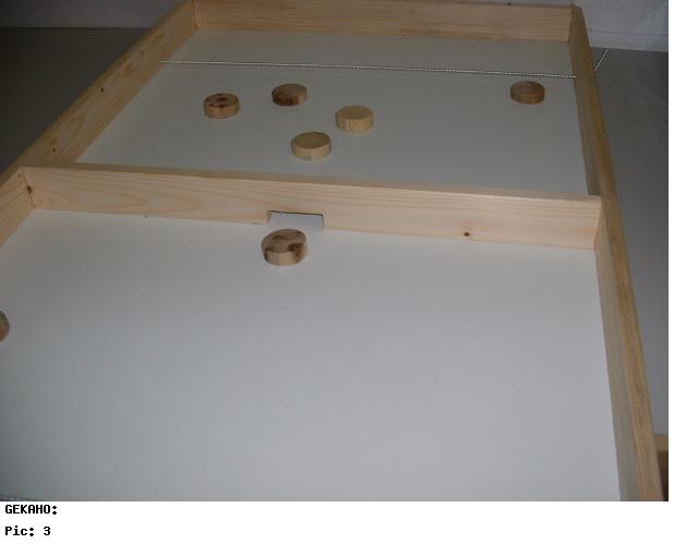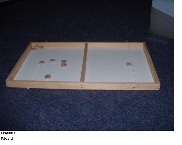 Das Spiel besteht aus 10 Spielsteinen und einem Spielfeld mit 2 Spielhälften mit je einer "Abschuss" Vorrichtung. Die beiden Spielhälften sind getrennt durch eine Mittelwand mit kleinem Schlitz - dem "TOR".