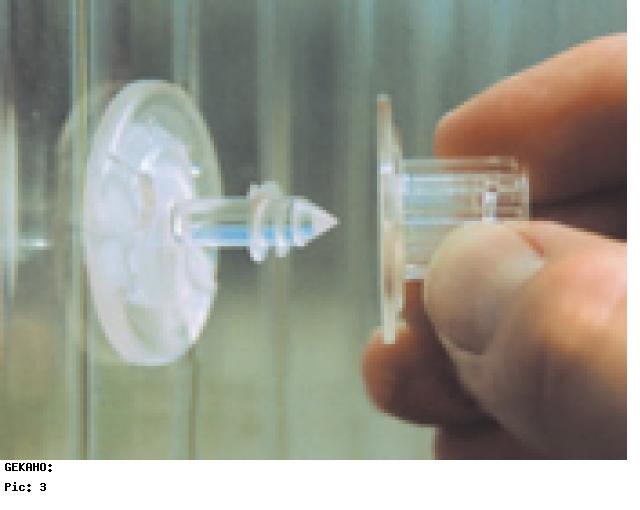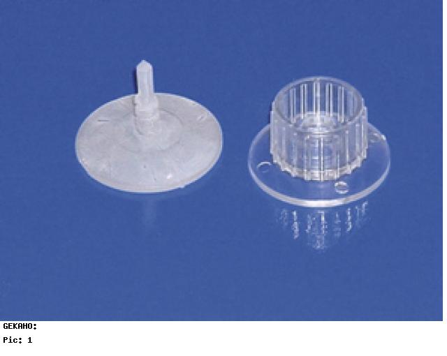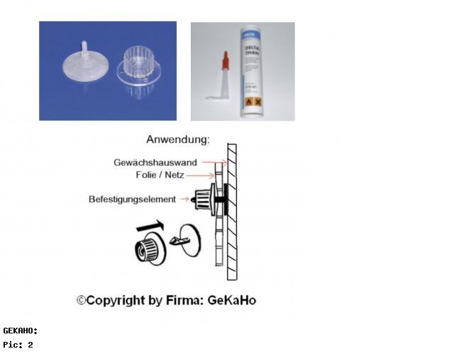 Die Befestigungselemente bestehen jeweils aus 2 Teilen. Der Teller mit dem Dorn wird mit Hilfe von unserem Spezialkleber oder Schrauben am Gestell oder Rahmen befestigt. Die Folie wird nun auf den "Dorn" gedrückt und durchstochen. Danach wird das Gegenstück wie eine Mutter von Hand aufgeschraubt. Genau so kann die Folie oder das Gewebe dann später durch aufschrauben wieder gelöst und einfach entfernt werden. Der festgeklebte Teller verbleibt am Gestell!