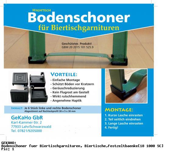Leicht zu montierende Bodenschoner für je einen Biertisch und zwei Bierbänke (entspricht vom Begriff her Bierzeltgarnitur, Festzeltgarnitur). Schäden an Bodenbelägen gehören der Vergangenheit an. Ausführung in hochwertigem Kunststoff. Schont Garnitur und Boden. Sehr robust, in Deutschland entwickelt und produziert.