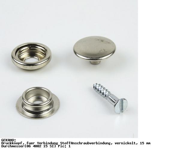 Die Druckknöpfe sind in der Farbe Silber, aus vernickeltem Hartmessing gefertigt und bestehen jeweils aus 4 Teilen (Kappe, Öse, Kugel, Schraube). Außendurchmesser ca. 15 mm