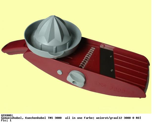 Der Gemüsehobel von GeKaHo ist ein praktisches Küchengerät zum Scheiben schneiden von Obst und Gemüse. Aber auch Würfel und Streifen sind damit schnell und einfach machbar. Der original TNS 3000 Gemüsehobel besteht aus einer lebensmittelechten Kunststoffplatte mit Handgriff und rechts und links je einem Drehschalter für die verschiedensten Einstellungen der Messer und natürlich dem Hauptmesser und den Vormessern. Dieser moderne Gemüsehobel benötigt keine auswechselbare Klingensätze für verschiedene Schnittstärken und Schnittformen mehr! Der TNS 3000 hat einen patentierten Drehmechanismus wo alle Einstellungen bequem durch einfaches Drehen der Schalter eingestellt werden können.