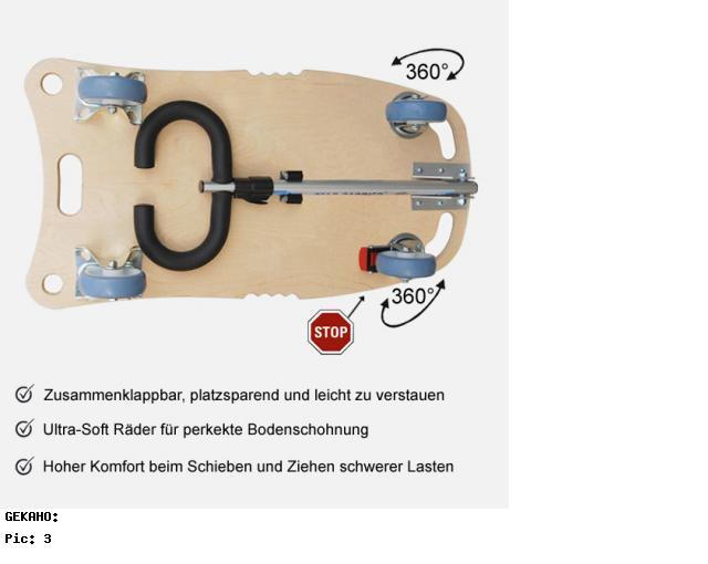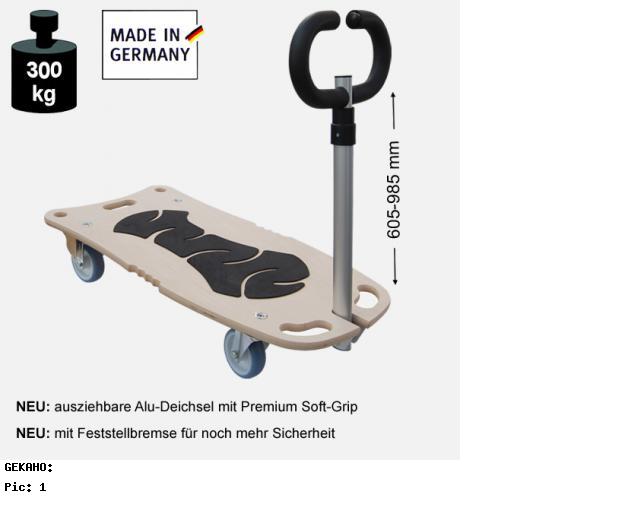 - Zusammenklappar - Tragekraft ca. 300 Kg.- Auflage aus stabiler 18 mm Multiplex-Platte - Oberfläche: Antirutsch beschichtet - Platte mit eingearbeiteten Tragegriffen- Ausgestattet mit 2 Soft-Lenkrollen und 2 Soft-Bockrollen (nicht lenkbar)- 1 Lenkrolle mit Feststellbremse- Rollendurchmesser ca. 100 mm - Zusätzliche Deichsel mit Teleskopfunktion (ausziehbar von ca. 605 mm - 985 mm