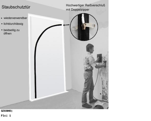 Not-Türe, ideal beim Renovieren um andere Räume z. B. vor Staub zu schützen während keine „richtige“ Türe eingebaut ist. Die Folientüre wird einfach mit Klebeband an dem Türrahmen befestigt. Sie ist mit einem Reißverschluss leicht zu öffnen.