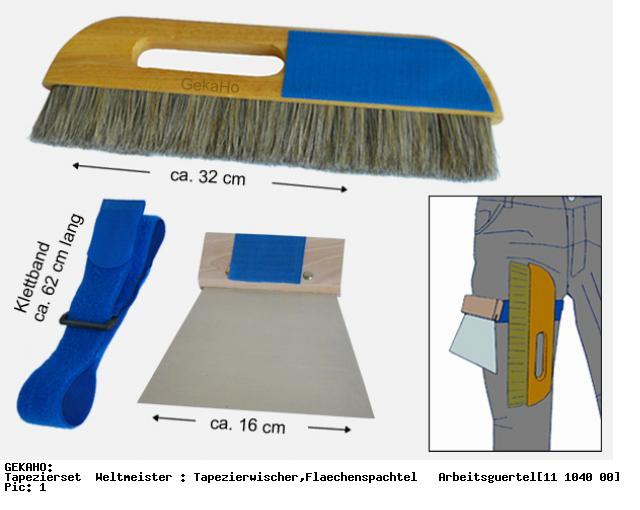 Bringen Sie die Tapete wie gewohnt an der Wand an und nehmen Sie dazu den "Wischer" oder die Spachtel zur Hilfe, welche immer schnell und sicher von derselben Stelle griffbereit zur Hand sind. Das Werkzeug ist am Körper, immer erreichbar und bestens platziert. Die Hände sind zum Tapezieren oder Besteigen der Leiter frei.