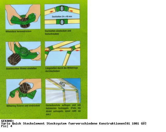 Die Vorgehensweise ist denkbar einfach: Dachlatten auf ca. Länge sägen, gewünschten Winkel einstellen die Steckelemente auf die Dachlatten schieben, mit einer kleinen Rundkopfschraube fixieren und danach einfach Gewächshausfolie, für ein Gewächshaus, Hasendraht bei Tiergehege, oder je nach Art der Nutzung Platten, Werbedisplays, Zeltplane, Zeltstoff , Dach Ziegel o.ä. auflegen und festnageln, tackern, schrauben o.ä. Fertig ist Ihr gewünschtes Bauwerk, das auch jederzeit wieder schnell und einfach zerlegt werden kann. Sie können also je nach Belieben Ihre Konstruktion auf- und abbauen!